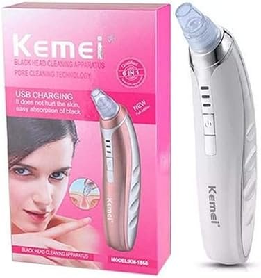 O aparelho removedor de cravos da Kemei opera com os principais níveis de potência, incluindo a de alta velocidade para a forte absorção de sujeitas e cravos, podendo ser utilizado para o nariz, ao redor da testa, queixo e bochechas.