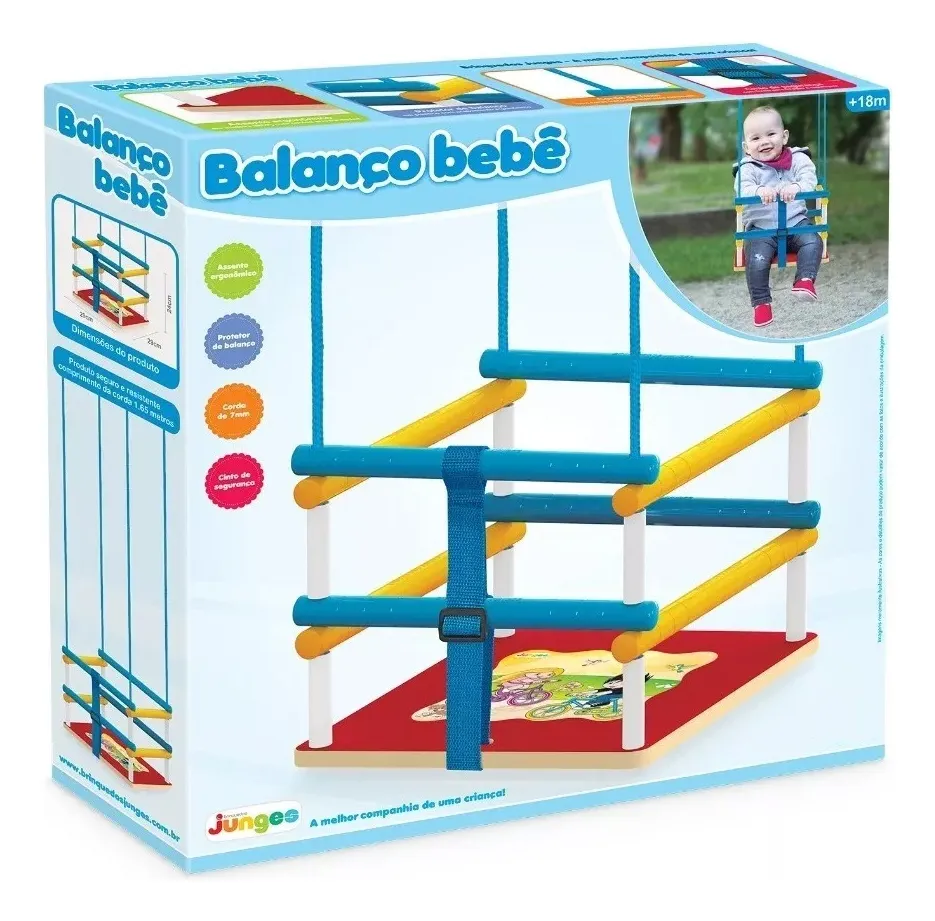 O brinquedo é fabricado em plástico resistente tanto no balanço quanto também nas cordas, acompanhando dois ganchos para a fixação em tetos e paredes. Além disso, também contém um encosto e barra de proteção para as pernas, proporcionando toda a segurança e conforto necessários.