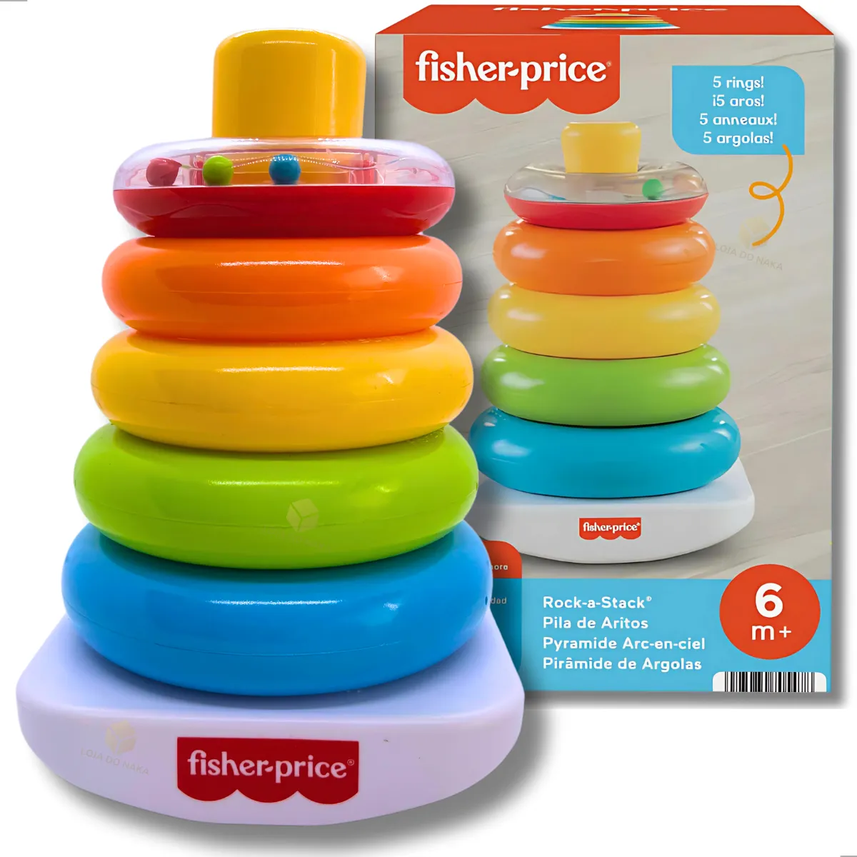 As marcas Fihser-Price e Mattel elevaram a brincadeira de encaixar argolas na pirâmide à um outro nível, nesse brinquedo com uma versão em 35cm de altura. Seu tamanho e cores fazem com que a atenção e curiosidade do bebê já sejam estimuladas. Além das argolas coloridas em formato tradicional, a última argola vem acompanhada de miçangas.
