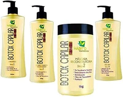| Itens do kit | Shampoo, reconstrutor, máscara, finalizador e silicone | Shampoo, queratina líquida, máscara e leave-in | Shampoo, condicionador e máscara | Gloss de cauterização e reconstrutor instantâneo | Shampoo detox, reconstrutor e máscara hidratante | Shampoo, spray renegerador, gloss reconstrutor e gelatina | Shampoo, máscara, condicionador e creme | Shampoo, condicionador, máscara e sérum | Shampoo, máscara e leave-in | Shampoo, condicionador e máscara |