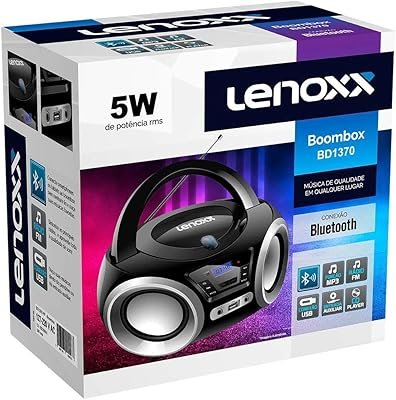 Esta boombox preta, da marca Lenoxx, é projetada para pessoas que gostam de um design moderno e arredondado. Seu amplificador e suas caixas acústicas possuem a alta potência de 5 W RMS.