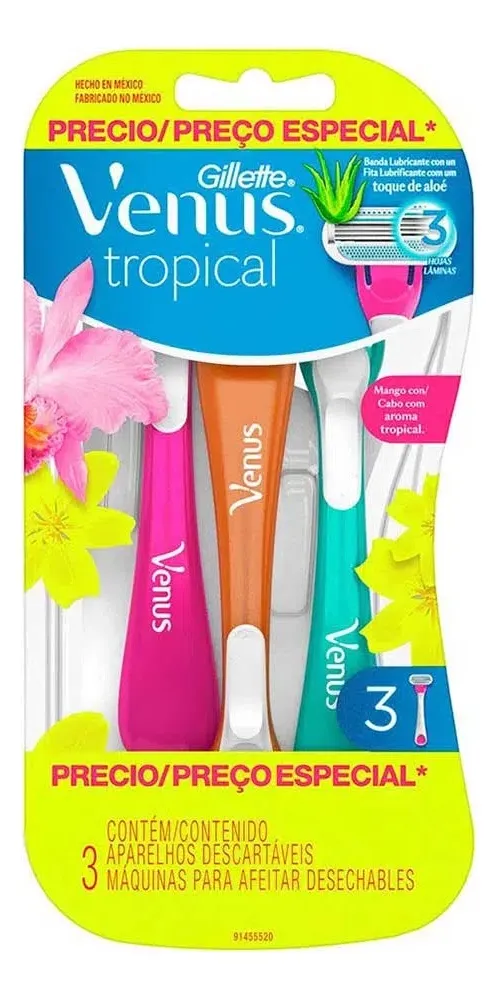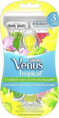 O modelo Venus Tropical é recarregável e seu diferencial são suas cinco fortes lâminas que podem durar até um mês cada refil. Esse modelo possui cabo ergonômico que se ajusta perfeitamente a sua mão dando segurança na hora da depilação, diminuindo o risco de acidentes.