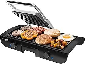 Ambas as placas são antiaderentes e seu material proporciona uma durabilidade além do comum, já que o inox é conhecido por ser um material de alto padrão. É possível controlar a temperatura e adaptar a chapa superior à proporção dos alimentos.