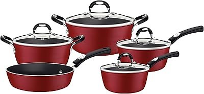 Esse jogo de panelas é extremamente durável, fácil de limpar graças a seu revestimento de cerâmica feito com substâncias naturais que não produz emissões nocivas na comida. Além de possuir tampas de vidro, que mantém o calor com mais eficiência, além de facilitar a visualização dos alimentos.