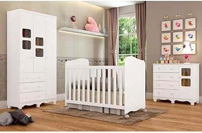 Você que está aguardando a chegada do seu bebê e está montando o quarto dele, vai amar este jogo de quarto para bebê com berço que vira mini cama, uma cômoda com quatro gavetas e um guarda roupa com quatro portas todos de cor branca.