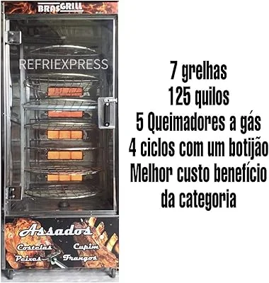 Além disso, conta com gaveta coletora de gordura que ajuda na limpeza, bacia interna em inox e queimadores em infravermelho para acelerar o assamento dos frangos. Pesa em torno de 85kg, o consumo médio é de 0,18kg/h por queimador e ainda tem 6 meses de garantia.