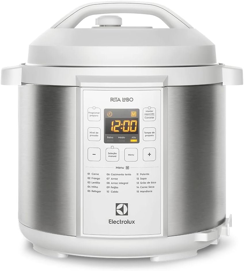 Além disso, ela permite que você ajuste a pressão interna da panela em três níveis diferentes, ajudando a alcançar o ponto ideal de cozimento de diferentes alimentos. A panela de pressão elétrica da Electrolux possui um display digital em LED e disponibiliza algumas funções, entre elas a Função Programar Preparo .