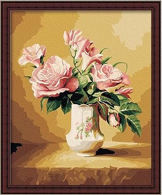 Esse modelo disponível de pintura por números DIY é perfeito para quem deseja criar com uma linha de cores com tema floral. Esse desenho remete as pinturas clássicas sem trabalhar a noção de profundidade, concentrada apenas na imagem em primeiro plano, para você passar o tempo dedicando-se a praticar o jogo de cores em torno do vaso com flores.
