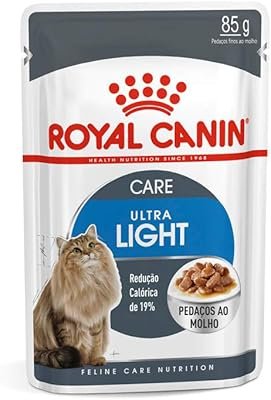 E todas as vitaminas necessárias para a saúde do seu gato. Devido ao seu uso especifico a ração Royan Ultra Light contém conservantes e corantes. Este sachê não tem um sabor específico, porém conta com ingredientes suínos e de aves. A Ração Úmida Royal Canin Sachê Ultra Light para Gatos Adultos foi criada para quem quer oferecer o melhor ao seu gato.