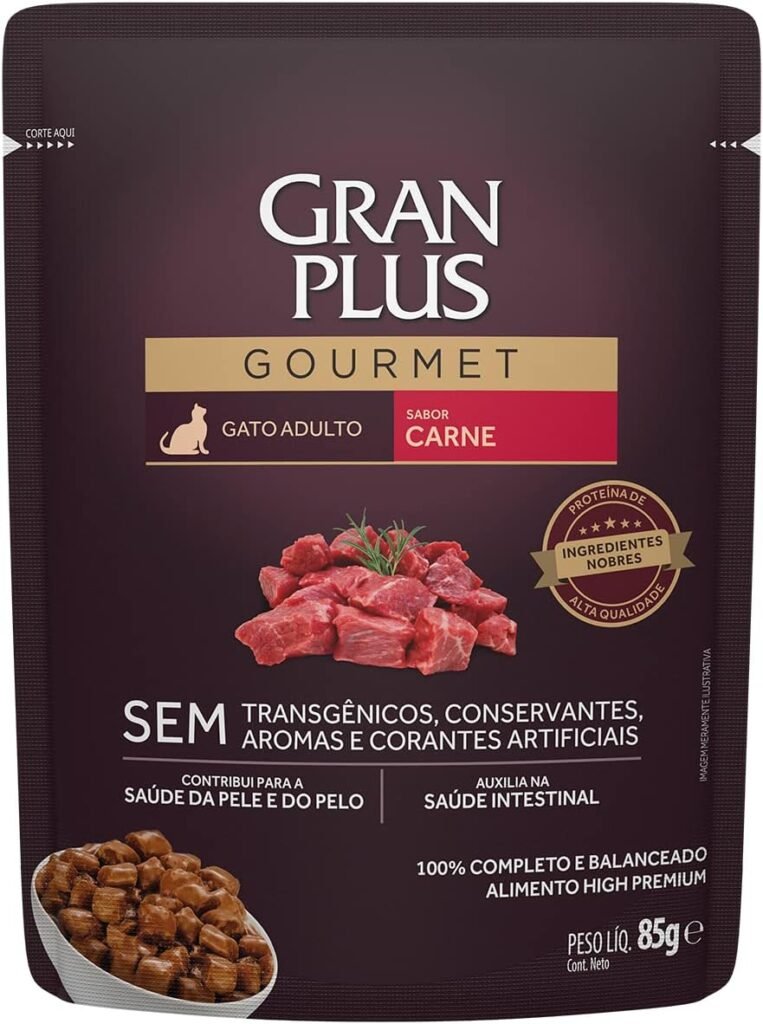 Se você procura um preço acessível combinado em qualidade premium na hora de escolher o melhor sachê para o seu gato, a marca Gran Plus pode te ajudar. Este sachê é indicado para gatos adultos com faixa etária de 1 a 7 anos e tem um textura de granulado maiores para simular a textura de uma carne. Seu sabor é de carne bovina com 1% do alimento.