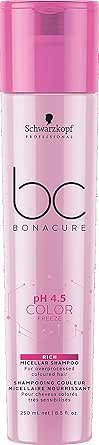 O shampoo micelar Color freeze da Bonacure é indicado para cabelos que necessitam de manter a coloração, sendo ideal para todos os tipos de cabelo. A proposta do produto é manter a cor dos cabelos pintados sempre vibrante e bonita. Segundo a marca, a tecnologia sem sulfatos ajuda o cabelo a otimizar seu nível de pH e previne o desbotamento da cor.