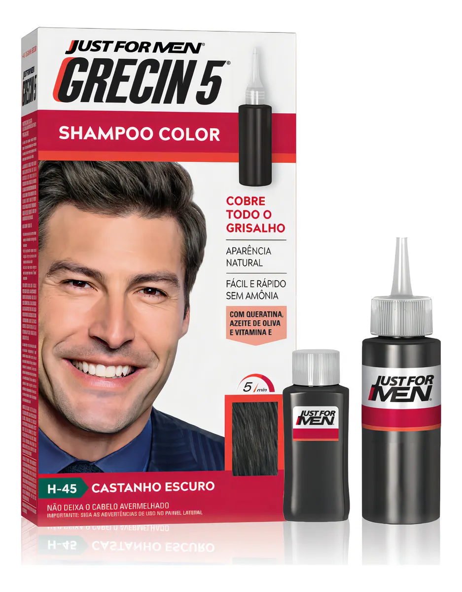 O melhor shampoo tonalizante para os homens que desejam fugir da química e do efeito permanente das tinturas tradicionais é o Just for Men, da marca Grecin. A coloração promovida por esse cosmético é muito mais discreta, pois ele age em combinação com o tom natural de suas madeixas, recuperando a cor dos fios grisalhos.