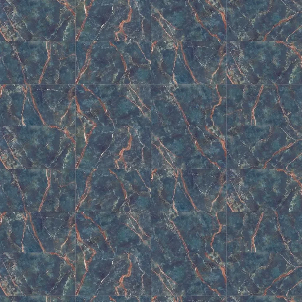 O produto possui uma variação de tonalidade moderada, onde as diferenças de cores entre as peças podem variar significativamente. Além de reproduzir os veios marcantes e irregulares em um fundo azul mais fechado, esse porcelanato recebe um super brilho polido.